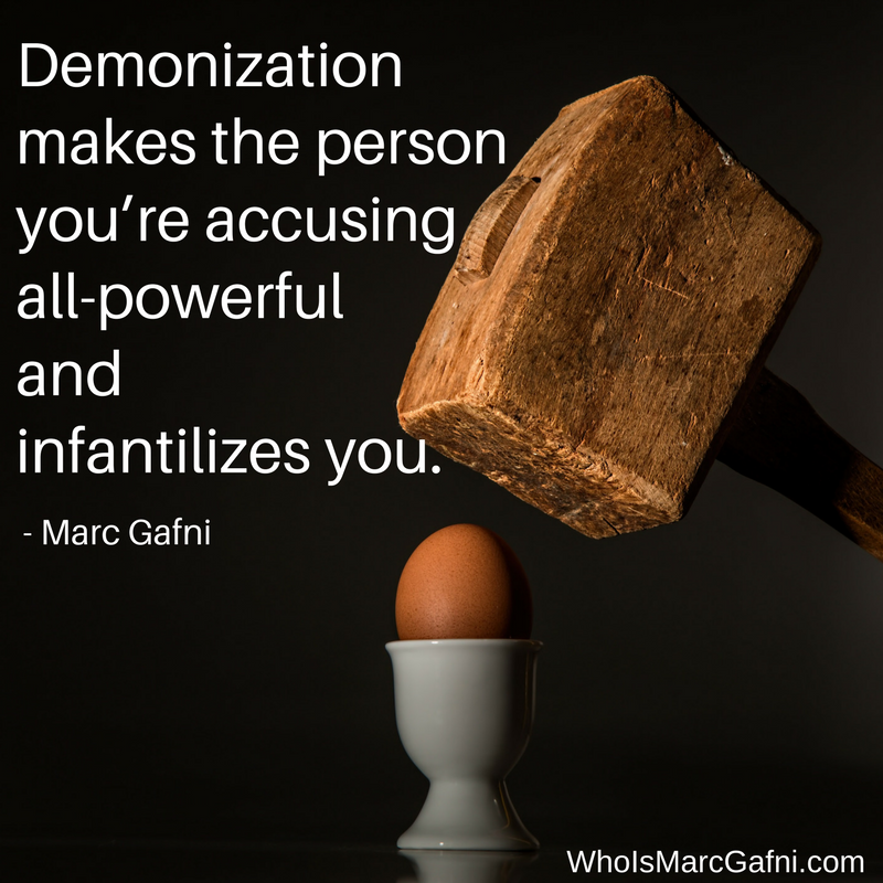 Reason three, you demonize a person because by ascribing to them demonic powers, they’re a witch, they have occult powers—part of the demonization campaign that I suffered, and it was brutal, was the amount of times it was written on the Web: he has occult powers, he has dark powers, he has demonic powers—what that does is it makes the person you’re accusing all-powerful and infantilizes you. And only if you’re powerless and they’re powerful can you then be a victim accusing them of being a perpetrator. But if you’re both powerful then there’s mutuality, then there’s responsibility. So self-infantilization takes place through demonizing the other person. Those are the three core reasons that we deploy demonization as a strategy in a false complaint story.
